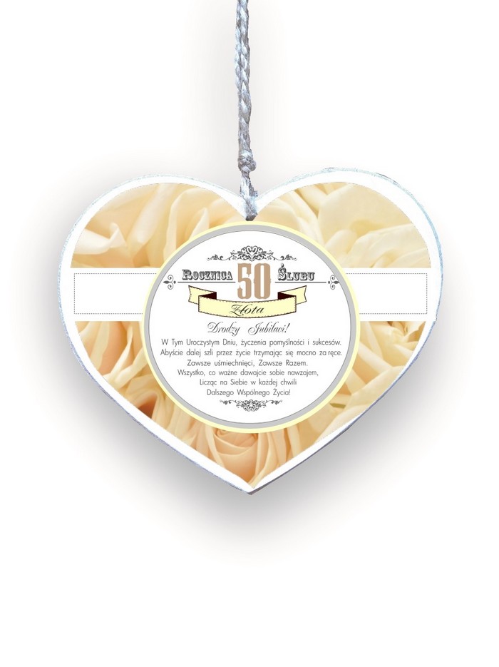 Drewniane serduszko 04 z tekstem "Rocznica 50 ślubu (złota)..."