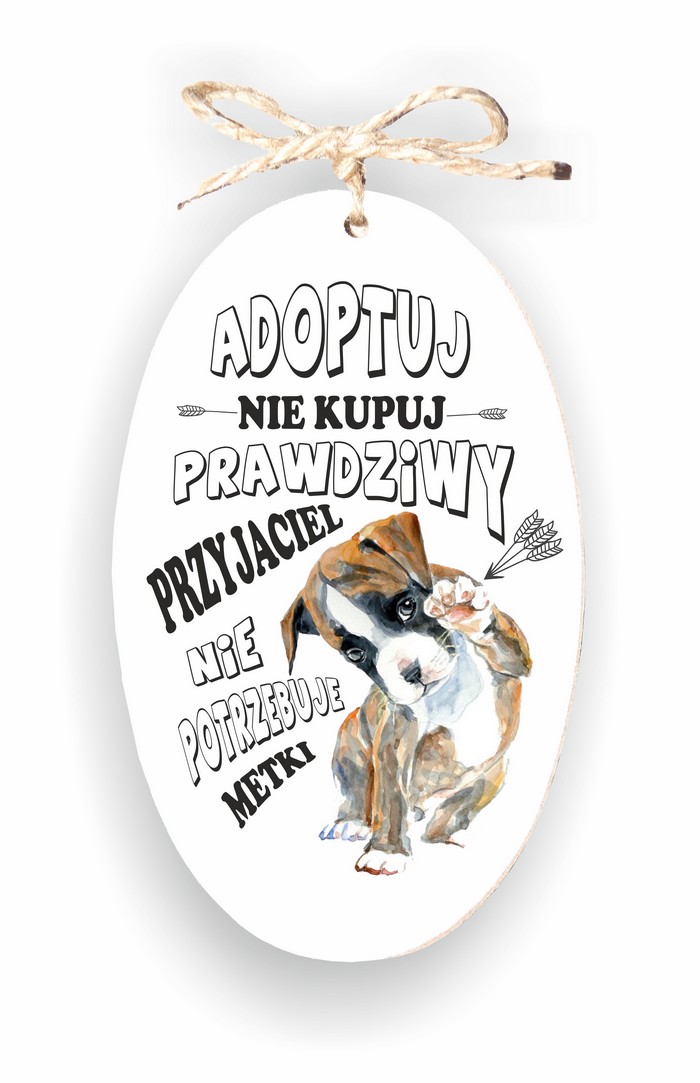 Drewniana elipsa 01 z tekstem "Adoptuj - nie kupuj..."