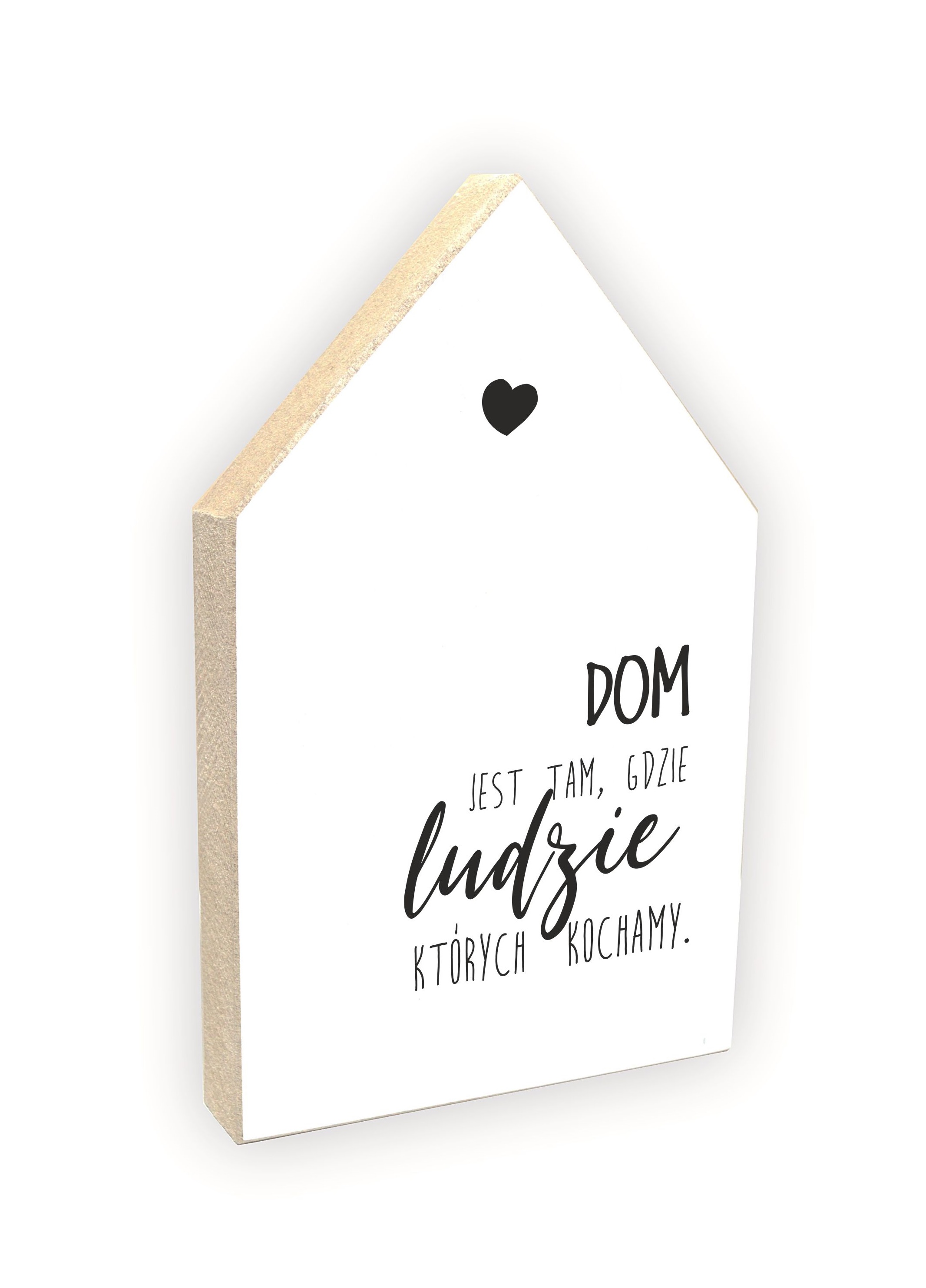 Drewniany domek stojący z napisem "Dom jest tam, gdzie ludzie..."