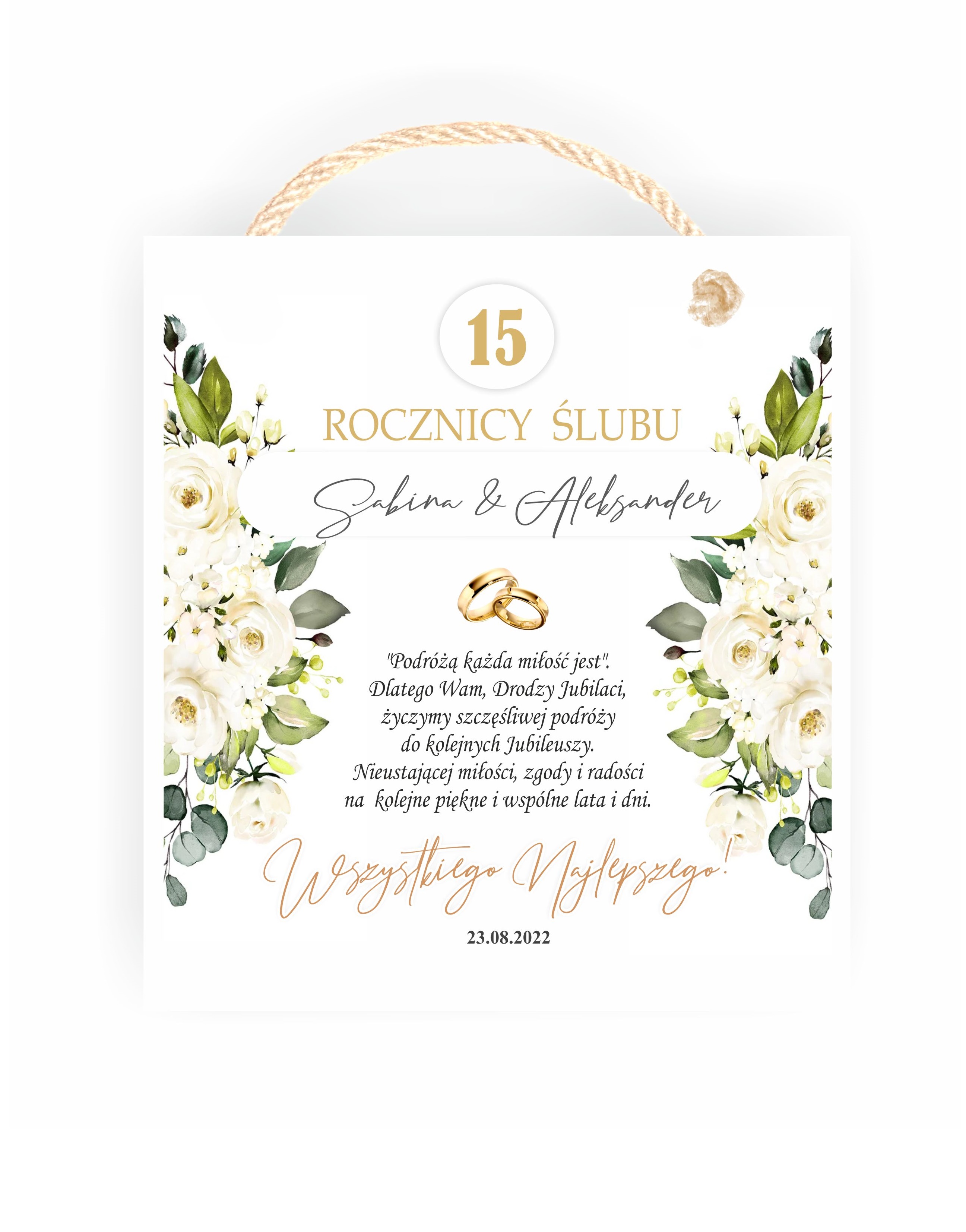 Drewniana tabliczka 05 z tekstem i grafiką jubileuszową, ślubną. Tekst: "Gratulacje z okazji Rocznicy Ślubu..." W kółeczku miejsce do wpisania cyfry jubileuszowej. Możliwość personalizacji, zobacz inne zdjęcie.
